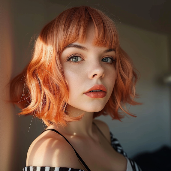 Apricot orange is one of the softest orange shades you can get your hands on, and there’s no denying it’s a flattering shade – especially for those with lighter skin tones. A soft, face-framing fringe pulls this look together.